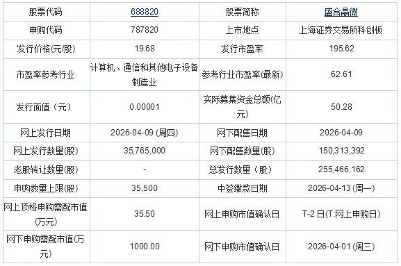 盛合晶微2026年4月8日披露的首次公开发行股票并在科创板上市发行公告显示,按本次发行价格19.68元/股和25,546.6162万股的新股发行数量计算,若本次发行成功,预计公司募集资金总额502,757.41万元,扣除发行费用约24,897.30万元(含增值税)后,预计募集资金净额约为477,860.11万元。
