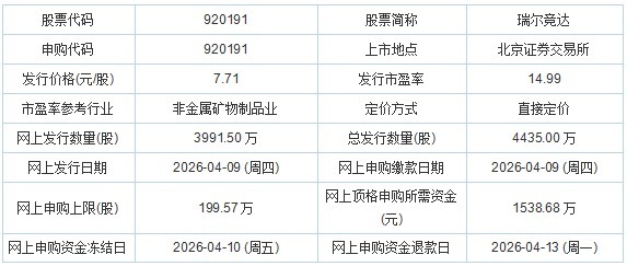 瑞尔竞达2026年4月7日披露的向不特定合格投资者公开发行股票并在北京证券交易所上市发行公告 显示,若本次发行成功,预计公司募集资金总额为34,193.85万元,扣除发行费用3,207.55万元(不含增值税)后,预计募集资金净额为30,986.30万元。
